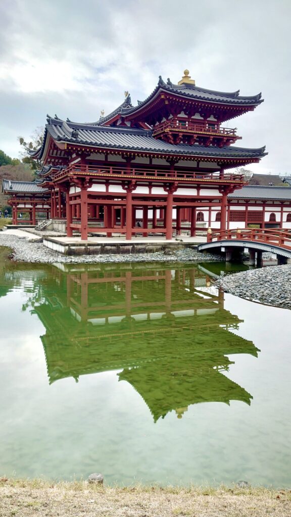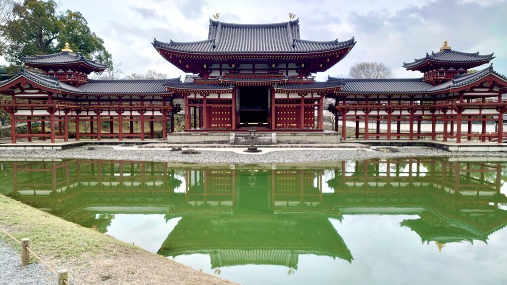 平等院鳳凰堂と聞いてピンとこなくても、「10円玉の建物」と言えば、多くの人が思い出すはず。優雅に羽を広げたような建物は、藤原時代の貴族文化の粋を集めた建築です。水面に映るその姿は、まさに極楽浄土。